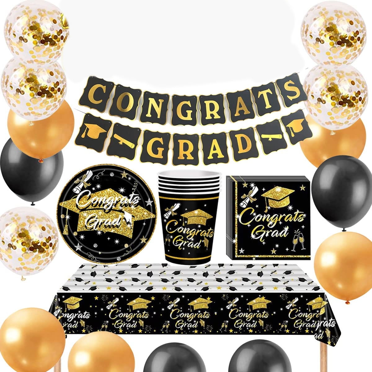 Zestaw zastawy stołowej papierowej na ukończenie szkoły. Dekoracje świąteczne dla 16 gości. Baner i obrus oraz kubki papierowe, talerze, serwetki, balony konfetti. Elegancki kolor czarno złoty dopełni szyku imprezy.
