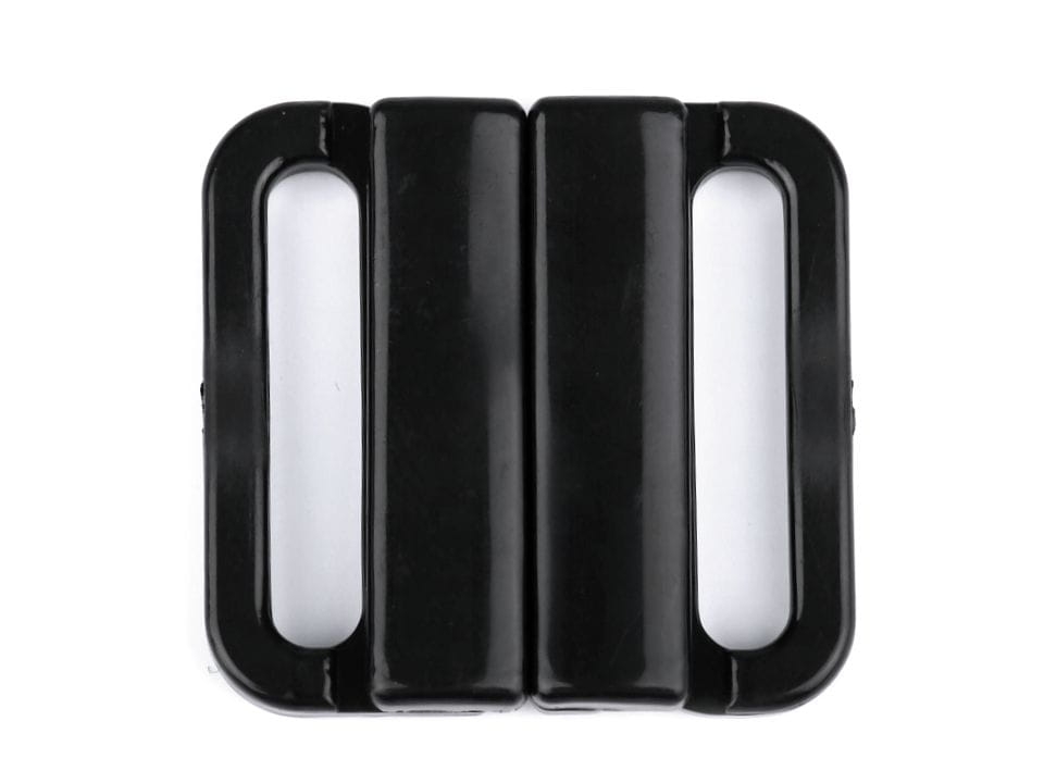 Plastikowe zapięcie do stroju kąpielowego. Zapina się poprzez wsunięcie jednej części między drugą część. Rozmiary jednej części klamry wynoszą 23 x 26 mm.