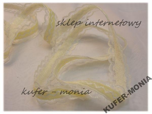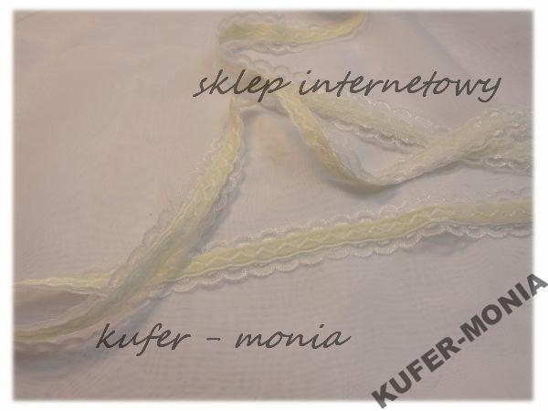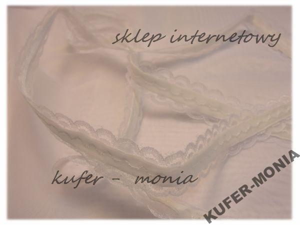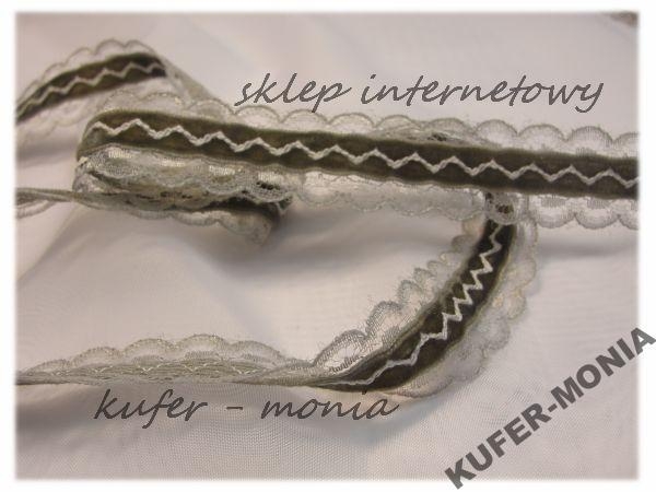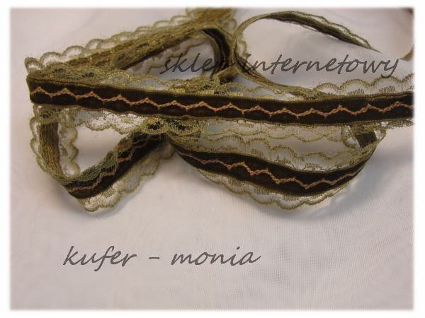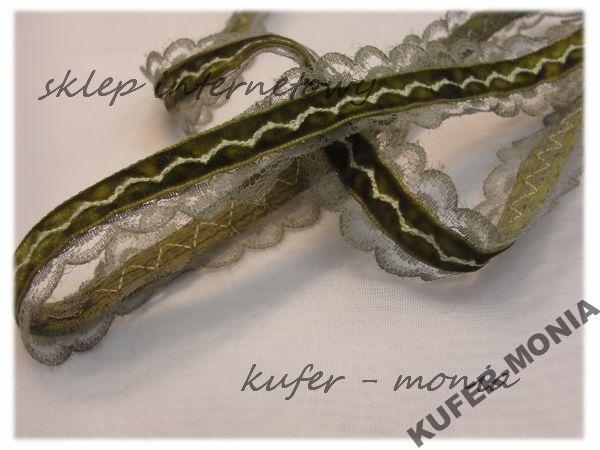 Taśma Ozdobna - koronka poliestrowa ozdobiona środkiem aksamitką. Szerokość całkowita 2 cm.